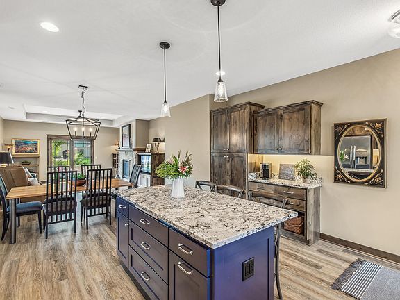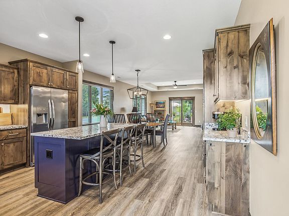 Step into this meticulously crafted custom-built home, standing distinct amidst its surroundings with unparalleled quality and unique features. This residence sets itself apart from the typical offerings in the area with its thoughtful design and superior construction. As you enter, you're greeted by the 10-ft tray step ceilings which adds an air of grandeur, complemented by custom 4-in millwork & solid wood doors throughout. The kitchen showcases knotty alder stained cabinetry and granite countertops, a testament to both elegance and functionality. The garage, insulated and sheetrocked, offers practicality alongside a concrete driveway. Outside, an extra-large concrete patio invites relaxation, and LP Smart Cement Hardboard siding that ensures durability and aesthetic appeal. Inside, a custom stone fireplace serves as the centerpiece of the living space, exuding warmth and character. The master bathroom features Carrara marble basketweave tile flooring, a soaking tub for ultimate relaxation, and dovetail custom knotty alder stained soft-close cabinetry. Practicality meets efficiency with Solar Shield on windows, enhancing comfort and energy savings. Surrounding the home are opportunities for outdoor enthusiasts, with wildlife, trails, and two parks nearby. This is not just a house; it's a statement of craftsmanship and luxury, offering a lifestyle that surpasses even new construction standards.
