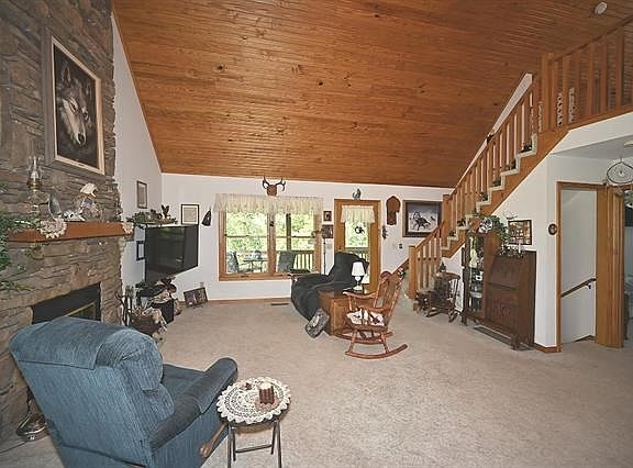 You will love this quaint cabin feel home, 3 bedrooms could be 4th in lower level.All open floor plan main level, kitchen with island, dining, large great room with amazing fireplace stone goes all the way to the ceiling, the ceiling is stained wood beautiful cabin feel walks out to the covered deck over looking beautiful tree's wild life, large master bedroom with walk out to the covered porch, master bath, walk in closet laundry area, separate shower and tub. Loft area carpet with ceiling fan over looks the great room area, could be 2nd bedroom, office, play room, family area! Lower level has one car garage with a 3rd bedroom or family room and another room that could be finished easily to be 4th bedroom along with finished full bath, could be family room with walk out to a large patio setting.The front of the home has a covered porch, with stones to the koi pond, landscaping is beautiful and so relaxing. The property has a very older barn which is useable but what a great place to take photo's!! This home is all electric.
