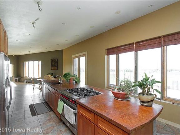 Don't be fooled by the exterior of this house, which happens to be all local repurposed barns & grain bins. The interior is completely modern and contemporary. Birch, cherry, mahogany, granite, slate, travertine, and concrete trimmings throughout. Features a Grand circle staircase and a sixteen-foot concrete kitchen island with stainless steel commercial appliances and solid cherry cabinets. You won't believe it's the same house you drove up to. Full ICF construction with triple pane windows. Radiant heated floors and walls throughout the house and the 40 X 40 machine shop make this feel extra comfy on the cold Iowa winters. Smart home system for lighting, shades, and security that can be operated from your phone wherever you are. Central vacuum. Over 1000 ft deck with curved rails and amazing views of the zebras next door, perfect for entertaining. A well-stocked pond and three acres, this property will AMAZE you.