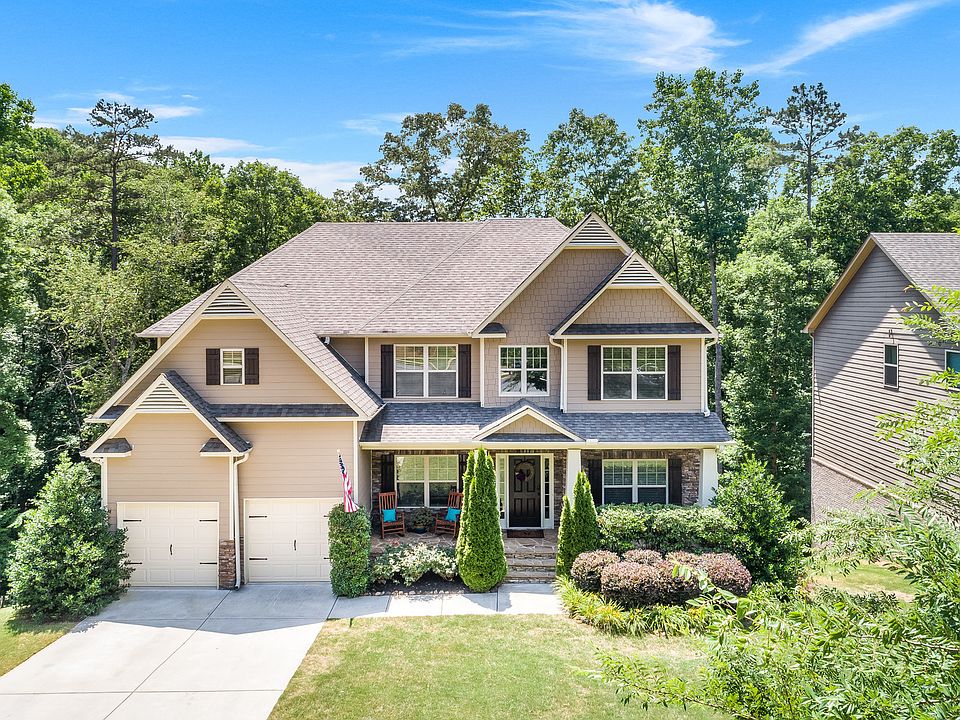 OPEN HOUSE SUN SEPT 15TH 2-4PM!! Gorgeous brick&stone accntd culdesac home w/covrd front porch backsup to wooded bliss.Open floor plan w/2story grand familyrm &foyer. French door entry into cofferred ceiling office &find trey ceiling and wainscot wall accented dining room, upgraded trim &crown molding in every room. Upgraded recessed LED lighting, large kitchen w/ upgraded cabinets, tiled backsplash¢er curved island w/ seating. Walk in pantry has upgraded wood shelving. You will love the Laundry rm w/ folding station. Bedrm/full bath on main. 4 spacious bedrms upstairs. Lge trey ceiling, master suite w/ sitting room& ext. crown. Upgrd tile selections in every bathrm. Extensive backyard decking for exceptional entertainment space. Join nearby amenities.