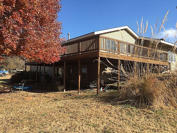 This home has a beautiful setting. Features 2 fireplaces one in upstairs family room and one in downstairs family room/4th bedroom. 3 bedrooms and 2 bathrooms upstairs. Formal sitting room, dining room and kitchen. Walkout basement houses laundry room, another bathroom, family room/4th bedroom and what is currently being used as a game room. But don't worry it also has a storm shelter under the front porch!! House, garden shed and storage container all sit on an approximately 6 acre lot. However, there is another 14 acres to the south of the property. Perfect for any hunter or possibly even a few head of cattle or horses.