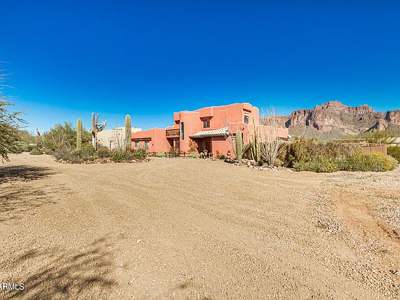 360degree majestic mt views. Photographers envy sellers view of Cougar Shadow appearing every Sept/March on Superstition Mtn seen from the bkyd that opens to the wash basin. Tastefully-designed-stands out from the rest. Well thought-out stucco adobe home w front/back balconies-enjoy the sunrise & sunset views. Nature paradise-107 native birds & 64 butterfly species visited the home. O/S lot-plenty of usable space to add RV garage or add storage unit. Dtchd 2 car cvtd to a usable a/c 25x30 wkshp-easily cvtd back to gar. Enter from the pea gravel circular drive, & desert ldscp w saguaro cacti. Lrg wind frame the Mtns from almost all rms. Lvng Rm ceiling w massive viga beams + firpl. Sellers relocating makes a perfect home to call yours. Sellers love the location, nbrs & views/ Click MORE Lots of space. Opens up to the eat-in kitchen, hightop brkfst bar. All bar stools, dining, patio & other interior furniture available on separate bill of sale. Roof resealed 2020 + 3 year hot water heater + newer Train A/C in workshop + all new kitchen appliances 2023 Home situated on 1.02AC. The Santa Fe charm is enhanced with 10ft+ ceilings, arched hallway, stained concrete floors in the main living spaces. Large master downstairs opens to a private patio & Pebbletec pool w/waterfall. Upstairs offers 3BR's;2 w/private viewing deck. The insulated, over-sized 2.5 garage w/AC is being used as work area & may be easily converted back to garage or guest quarters. Lrg laundry rm w utility sink w updated washer & dryer. Relax on the back patio to take in the serene mtn views. This home is truly unique in location & style.