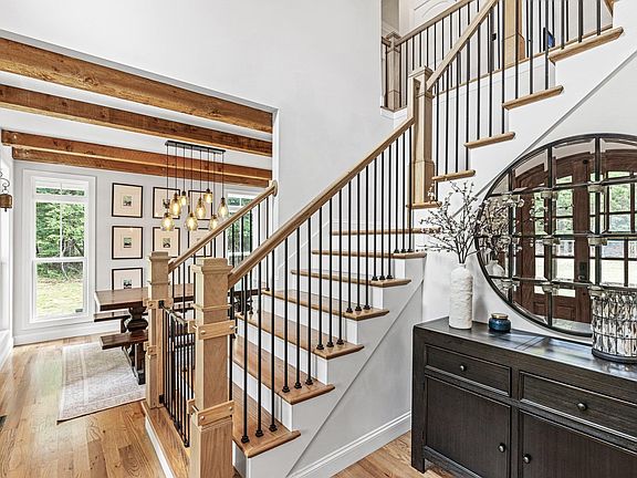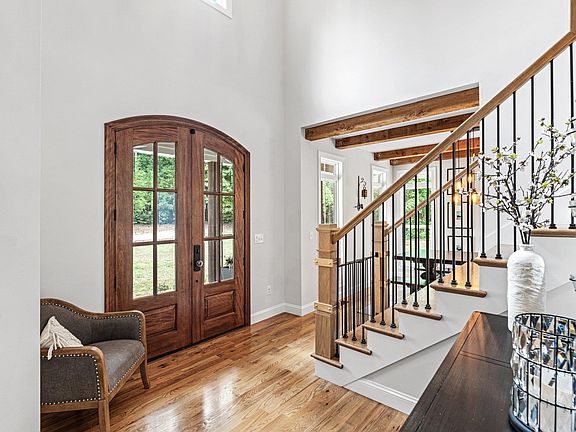 Just a few miles beyond the charming entertainments of Fountain Inn, lies a private enclave of country elegance. Situated on 3.5 private, wooded acres, this custom-built modern farmhouse offers luxury and style, loads of natural light, and outdoor spaces you are sure to love. This Frank Betz Culbertson plan was built by the renowned Cobblestone Homes in 2018. Imagine relaxing on the wide, wrap around front porch before welcoming guests into your gorgeous home through the arched mahogany double doors. From the two-story entry, proceed to the left and behold the formal dining room with (real!) cedar beams gracing the ceiling. Continue on into the chef’s kitchen with white cabinetry reaching all the way to the ceiling, high-end kitchenaid appliances, and a HUGE eight foot island with farmhouse sink. The Negresso Brushed granite countertops are stunning and there is even a potfiller over the stove. Just off the kitchen is the keeping room with one of the two fireplaces and a full cedar mantle. From here, step out onto the large trex deck overlooking your very secluded backyard. Opening off the front of the kitchen is a breakfast area with pantry and then the great room, which has another gas fireplace and a wall of floor to ceiling windows, which bathes the room in natural light. Take note of how the hardwood floors gleam as you traverse this home- as they are throughout both levels! Upstairs hosts three spacious secondary bedrooms with walk-in closets, a spacious laundry room, and the luxurious 487 square foot Master suite. This retreat offers coffered ceilings, a multitude of windows, and a bathroom your friends will be envious of with Granite topped cabinets, porcelain tile floor, a sliding barn door, and a huge custom tiled shower with long bench and recessed shelving. There are even dual closets with custom shelving leaving plenty of room for your entire wardrobe. Additionally, there is floored storage in the attic space and the custom shades stay with the home. Stewart Farm Estates is a tight knit community of high-end properties located just 10 minutes from downtown Fountain Inn, 15 minutes to Fairview Road, and 35 minutes to downtown Greenville. No HOA in this neighborhood, but it is deed restricted. Horses and chickens are allowed! So come on out to the country, grow a garden, raise some chickens, and live the good life!