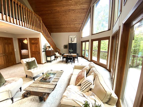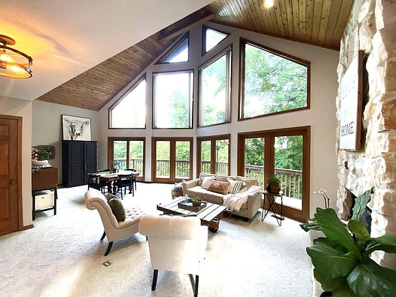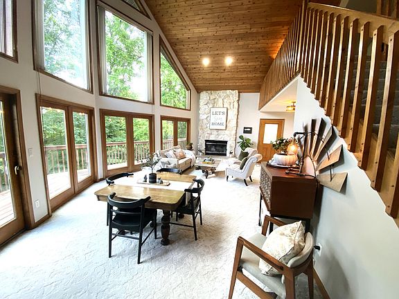 Quality custom-built A frame styled home is located on a peaceful and private 2+ acre wooded lot. 2 story vaulted Great Room is highlighted by huge windows providing incredible natural light throughout the home. Floor to ceiling stone fireplace. Huge wrap around deck provides the perfect setting for bird watching and peaceful enjoyment. Convenient eating space in the kitchen plus a large center island provides ideal workspace. Plenty of cupboards and nice window over kitchen sink. First Floor master suite and laundry. Upstairs loft area ideal for office/work out area. Beautiful wood trim and 6 panel doors. Full walk out lower level is ready to be finished into extra living space.