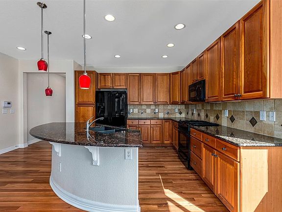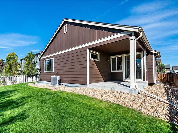 This Commerce City one-story home offers a den, electric fireplace, granite kitchen countertops, master walk-in closet, master bathroom duals sinks, covered patio, and a three-car garage.
