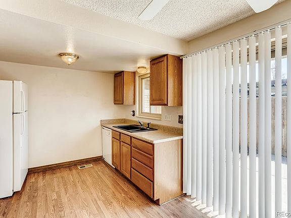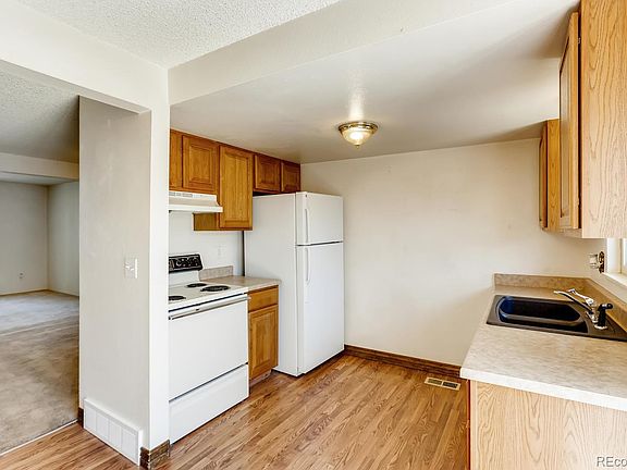Great Opportunity! Clean, Clean, Clean! This home features a nice kitchen with laminate wood flooring, pantry, separate eating space off kitchen, refrigerator is included. Formal dining area and living room with newer carpet and guest closet. Half bath on the main floor. Two nice sized bedrooms upstairs with ceiling fan and walk-in closet in one of the bedrooms. Second bedroom has two closets and ceiling fan. Full bath in the middle of both bedrooms. Basement is open for and optional second family room. Laundry area with full size washer and dryer hook ups and extra storage area. Fenced yard with reserved carport steps from unit. Hurry, this one won't last!