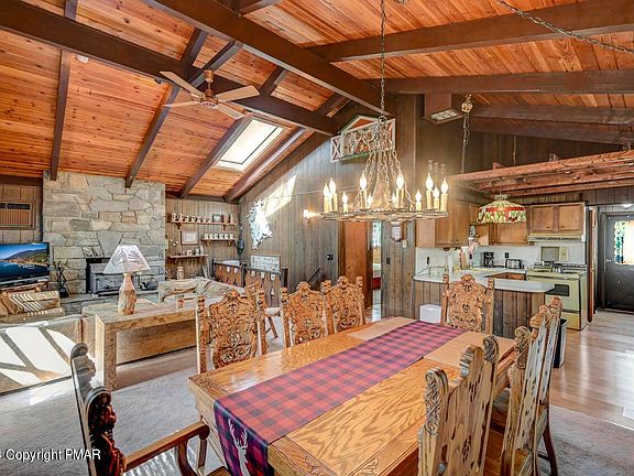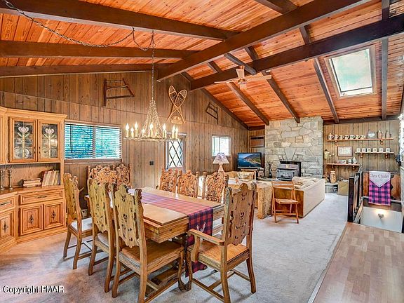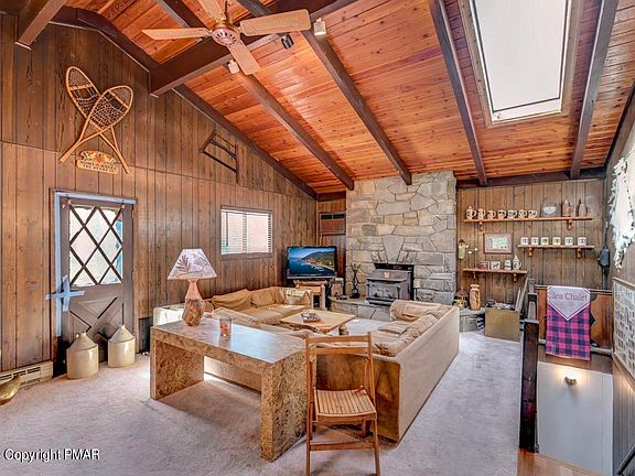 Nestled in the heart of the Pocono Mountains, this charming Swiss Chalet offers a serene escape. The open living & dining area boasts vaulted tongue-and-groove ceilings & exposed wood beams, creating a cozy atmosphere. Relax by the warmth of the wood stove in the stone fireplace, or whip up a delicious meal in the kitchen. The main level also features a convenient laundry room, primary bedroom, & bathroom. Downstairs, the recreation room and wet-bar provide the perfect space for entertainment. Three additional bedrooms and another bathroom offer comfortable accommodations for guests. Situated in Barton Glen, this home is just a short stroll to the picturesque lake, playground & picnic area, and pool. Close to all ski mountains and Pocono area attractions.