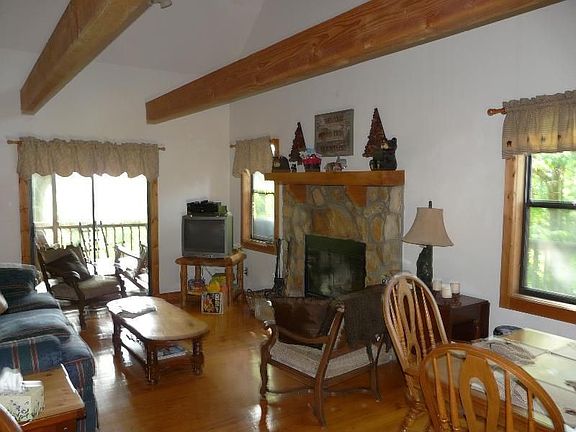 Long & short range views from your large screened in back porch and tons of privacy. Totally wooded lot & close to town. Real wood burning fireplace and 3 sides of covered porches and decks.