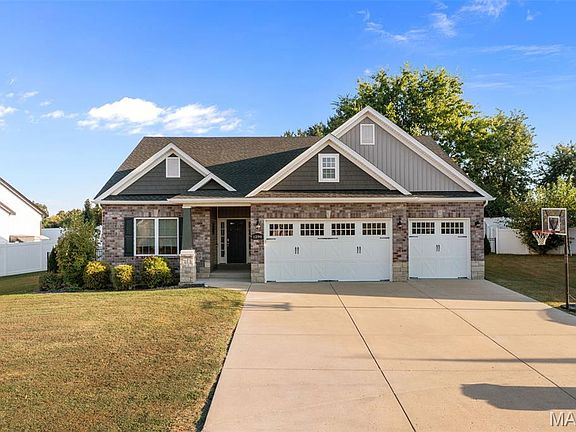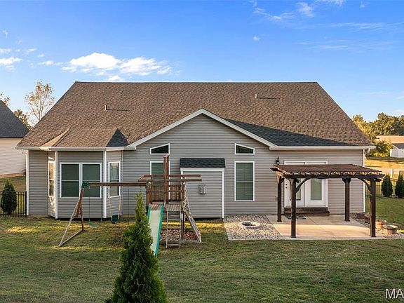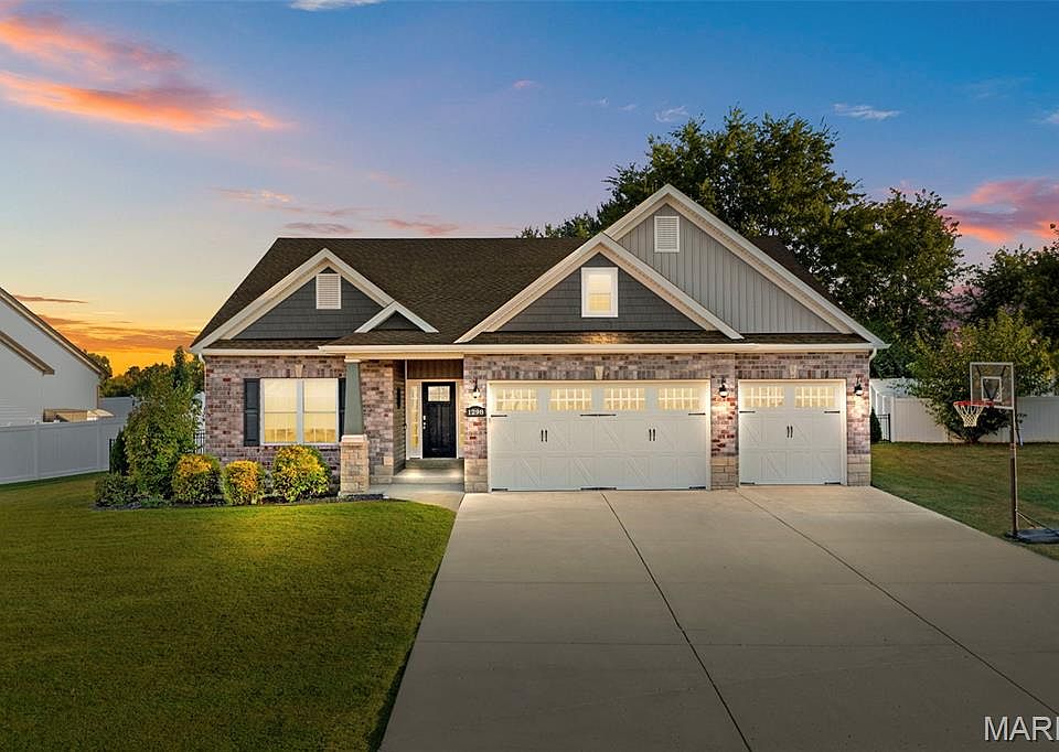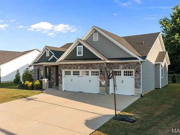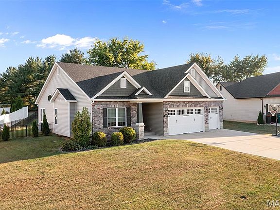 Welcome home to 1298 Riesling Lane, a stunning ranch-style residence nestled in the heart of Pevely within the desirable Vineyards subdivision. This expansive home boasts 3 spacious bedrooms and 2 beautifully appointed bathrooms, offering a generous 1,882 Sq Ft of living space. The open floor plan is ideal for entertaining, featuring gleaming hardwood floors and cathedral-height vaulted ceilings that create a bright and inviting atmosphere. You'll love the luxurious quartz countertops and custom cabinets in the kitchen, along with the oversized walk-in pantry and convenient main floor laundry room. Relax in the serene master suite, complete with his and her closets and a spa-like master bathroom that provides the perfect retreat.