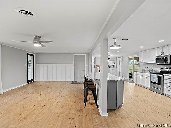 This home is a must see! All the updates have been done for you. Close to Madison, Hanover, Scottsburg and Charlestown. 3 bedroom, 1 1/2 bath home that sits on a nice size lot. Back yard is fenced with privacy fence and chain link. Some of the many updates of new or newer items include: paint, granite, stainless steel appliances, 6" guttering, windows, garage door, 1/2 bath all new, carpet, 10MM Pergo waterproof flooring and lighting. Nice patio in back is perfect for relaxing or entertaining. Large yard includes an above ground swimming pool and a large yard barn/garage. Storage room on back of the house would make a perfect gardening shed or pool house.