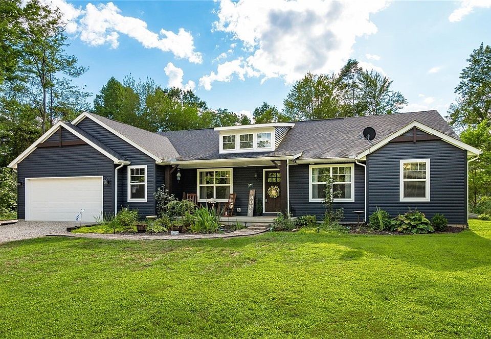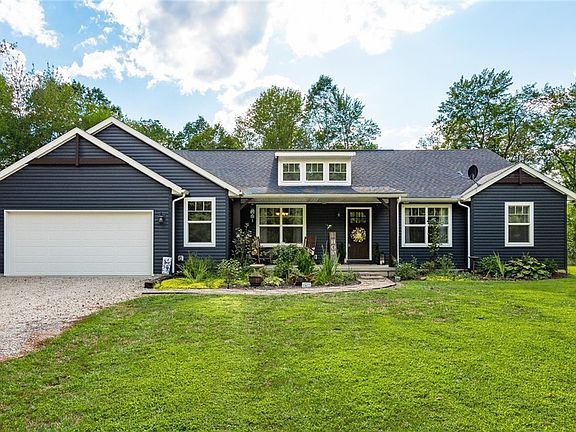 9.017 acres. Built in 2020, this stunning, spacious, single story 4 bedroom 2 1/2 bath home offers modern comfort, timeless style and craftsman charm. The thoughtfully designed split bedroom layout ensures privacy. The master suite is both luxurious and spacious featuring walk-in closet, separate shower and soaking tub. Enjoy entertaining in the formal dining room. Work from home in the dedicated home office. The heart of the home is a gorgeous fully equipped kitchen with high ceilings, spacious island, granite countertops and stainless appliances - perfect for home chefs. First floor laundry room/pantry/mudroom connect the kitchen to 2 car attached garage. Full basement with outside access and 9' tall ceiling height. Relax on the covered front or back porch and take in the surrounding acreage. Play in the above ground pool. New 10 x 12 shed with a loft. Ample indoor and outdoor living space make this property a rare find with function, privacy and charm. Public water. Paved roads. Country setting.