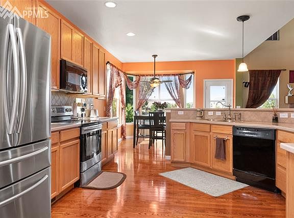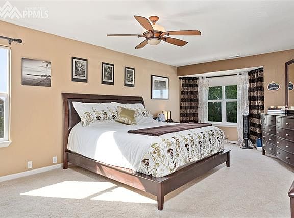 Immaculate 2-Story home! 4BR/3BA/3-car with dual-zone heating and air conditioning. Backs to beautiful park with unobstructed Pikes Peak and front range views. Dynamic home elevation situated on spacious manicured corner lot offers great curb appeal. The main-level provides an open floor-plan with a bright 2-story living room area. Hardwood floors greet you at the entrance and carry through to the kitchen and casual breakfast nook. A formal dining room, bedroom/office and laundry complete the main-level. The upper level consists of 3 bedrooms and a spacious loft/play area. The large Master Bedroom is accessed via a sky-bridge from the open loft area. The Master Suite offers a bay window with exceptional mountain views, a walk-in closet and en-suite 5 piece bath. A large unfinished basement gives the new owner tons of flexibility and room for growth!