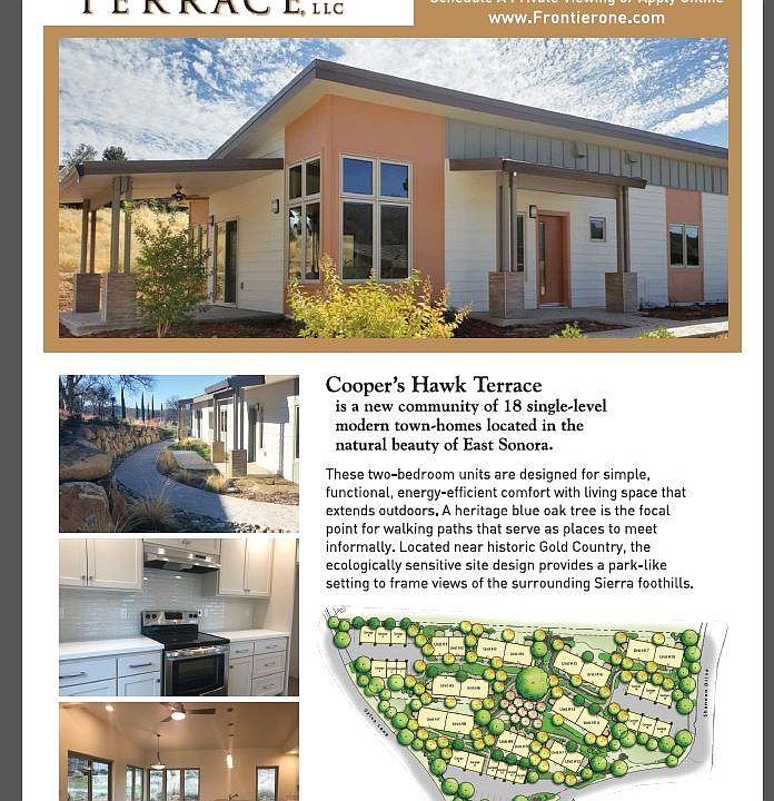 2/2 with garage - 12988 Beckwith Rd. - Off Greenley Rd. Sonora CA New Construction - ADA friendly Exclusive Features Center kitchen Island with exotic quartz and granite countertops ~ Subway tile back-splash ~ Posh Pendant lighting and thoughtfully placed motion activated lighting ~ Lots of natural light ~ ADA friendly with generous hall and door widths, walk or roll in showers and grab bars ~ Stainless appliances include; glass cook-top range, dishwasher, refrigerator, washer and dryer ~ Window Coverings ~ Covered Veranda with ceiling fan. Simplified Living ~ Blending simple, functional, energy-efficient comfort together with a first class living experience that extends outdoors to a covered veranda with a ceiling fan that opens to a park like setting with native and water wise plants lining the interior walking paths that surround a magical blue heritage oak tree, inviting its residents to relax and breathe in the majestic Sierra foothill views. All you need within a Mile and a half Grocery shopping ~ Adventist Health Medical Center ~ Pharmacy ~ Post office ~ Tuolumne County Library ~ Cafes, restaurants, and shopping ~ Movie theaters ~ Farmers market ~ Gas stations and car wash ~ Legal Services Outdoor and Recreational Activities Nearby Pinecrest Lake and Trailhead ~ Dodge Ridge Ski Resort ~ Yosemite National Park Directions: From Mono Way to Greenley Rd, turn right on Cabezut, then right on Sylva Rental Info And Showing Request Rental Information Request To qualify for this home, you must have established credit, a steady source of income, and a good rental history or home ownership. A one year minimum occupancy is required and longer is available. Smoking is not allowed in any of our units, or on this property. Pets by agreement only, and on a case by case basis Tenant pays their own utilities