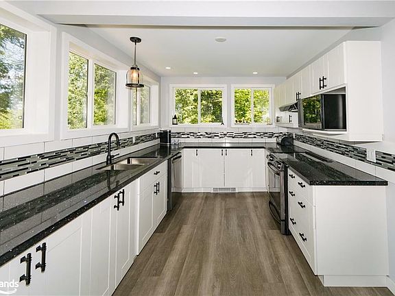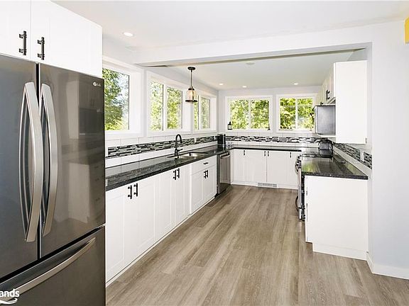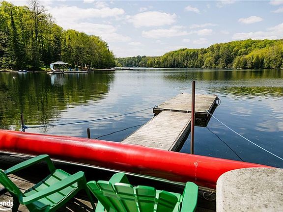 4 Season Fun! Miskwabi/Long Lake Boating Chain! This charming 800 sq. ft winterized cottage features 3 bedrooms and an open concept design that seamlessly blends into a chef's dream kitchen. Unleash your culinary creativity and entertain effortlessly; dine under the stars on the deck overlooking nature's canvas! Every inch meticulously updated for modern comfort – all renovations expertly crafted with dock time calling your name! Nestled above the lake, this elevated gem boasts an impressive 200 feet of very private, pristine shoreline. A sturdy stepped stairway (130+ steps) entwined with a meandering path descends gracefully to a picturesque lakeside patio/dock where aquatic adventures await. Dive into crystal waters or cast your line off the dock - Long Lake is renowned for its exceptional Trout & Bass fishing opportunities. As evening falls, cozy up by the woodstove in the living room OR RELAX IN THE HOT TUB UNDER STARRY SKIES. Located on a township-maintained road in close proximity to Haliburton Village's local amenities, shopping, hospital, schools, golf courses, and Sir Sam's Ski Hill.