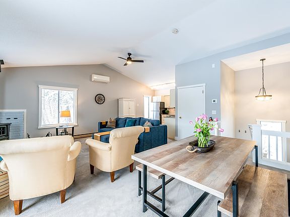 Seasonal Views of the Qttauguechee River from this bright and spacious end unit at Mill Run. The recently updated condo has a great open space for day to day living or entertaining. The sitting area which is open to the kitchen and dining area has a wood burning stove for the those cold winter nights. There is a half bath on the upper level. The great room has a mini split for A/C. The lower level has 2 bedrooms, a full bath and laundry. The primary bedroom has a slider to a patio area. There is a private side yard for outdoor enjoyment. The condo comes completely furnished.Convenient to the club, walking trails, lake, ski hill, golf and pools. Easy access to shopping and highway.