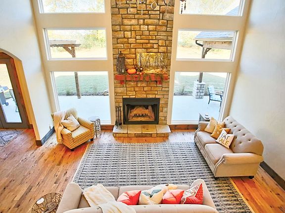 This fantastic Country Home is truly breathtaking inside and out. The custom brick is made to look reclaimed and the coordinating planter shelves under the window finish the look! It is adorned with a wall full of dazzling windows that make you feel as if you are living outdoors. There is an open concept throughout the home that flows from room to room with impressive 20 ft. tall ceilings, wide arched doorways, exposed wooden beams, and gorgeous White Oak rough sawn hardwood floors making the rooms feel even larger. The home features two fireplaces; one wood burning in the living area and the other gas in the master suite. There is a state of the art sound system on the first floor and outdoor patio with volume controls in each room to create the perfect atmosphere for get-togethers. Enjoy a generous kitchen space that will accommodate the proudest cook and allow them to easily entertain a large group of family or friends. Beautiful granite countertops, an extra-large island with sitting area, buffet, coffee or baking station, gas cooktop with custom vent, double ovens, two sinks and custom cabinets and some floating shelfs create a gourmet kitchen. In the master suite doors lead to covered deck for sitting at the end of the day, or if you prefer a relaxing bath in the most up-to-date soaking tub or feel your cares wash away in the large rainfall walk-in shower. The upstairs contains 4 spacious bedrooms, 2 baths, and a large family room. Three of the bedrooms include a second master bedroom with bath and two bedrooms connected by a wonderful Jack & Jill Bath .This turn-key home includes all the stylish furniture and modern appliances making it move in ready! There is a large outdoor entertaining area with covered living area and pergola with polycarbonate roof and tastefully decorated with hanging lights. An unexpected highlight of the property is an amazing 150 sq.ft treehouse with lights and hammock! The farm with acreage has excellent pasture and hay, frost free hydrants, and is fenced and cross fenced; just add livestock and you are ready to go. The private tree-lined drive will make you think you are far away from it all, when in reality you are only 2 short miles from the West Plains retail district. The location also puts you close to some of the best lakes and rivers, National forests and Conservation Areas, Natural Springs and Caves, and Historic Mills and schools in Southern Missouri. High-speed fiber cable runs along property line that could be connected to the home.