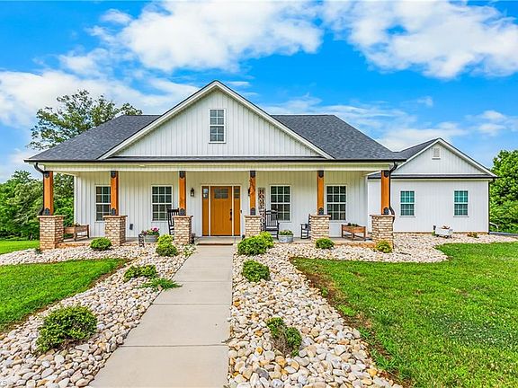 This beautiful home offers roomy, comfortable living in a peaceful country setting. Inside, enjoy an open floor plan with a striking rock fireplace, a functional kitchen with granite countertops and an eat-at bar, and plenty of natural light throughout. The primary suite is a relaxing retreat, featuring a garden tub perfectly placed to take in the view of Pilot Knob. Two additional bedrooms are generously sized for family or guests. Step outside to a covered porch, fruit trees, and wide-open views—ideal for enjoying country life! Additional highlights include a large garage with ample space for vehicles, storage, or a workshop, an outbuilding with lean-to for extra storage. This home also boasts a commercial-grade asphalt circle drive. Nicely landscaped with rock for flower beds and borders. There is also a huge patio area for entertaining. A perfect blend of comfort, charm, and practicality.