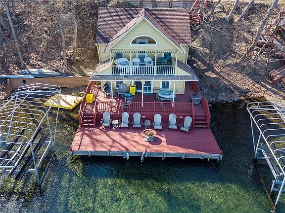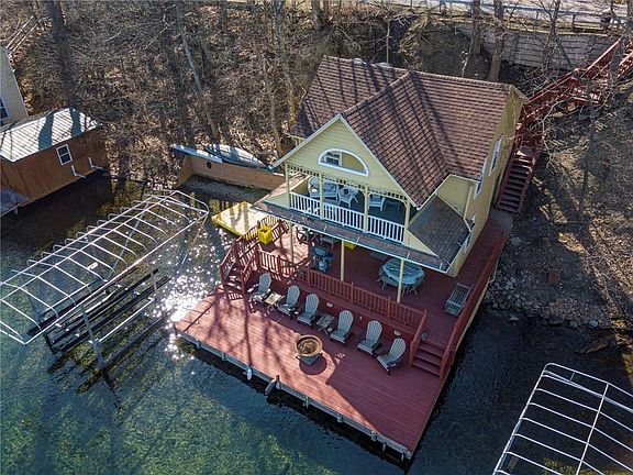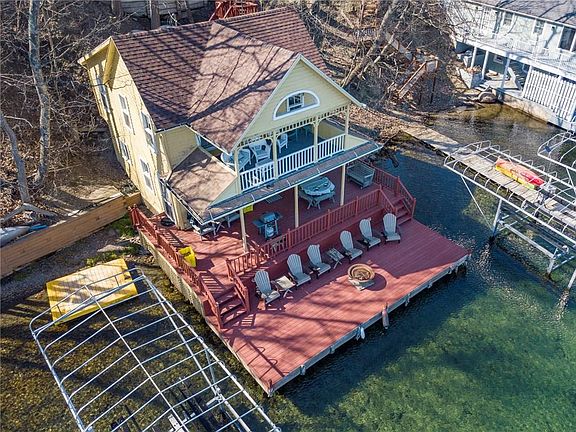Keuka Lake's Victorian Lady....65' of Lake Frontage and located right at water's edge. This 3 bedroom, 1 1/2 bath, boasts of 2 large open porches (one on each of it's two levels). A short permanent dock and decking system off the lower porch, and natural water entries for the kids on both the North & South sides of dock. The views are breathtaking as you look to the North at the tip of the bluff and to the South towards Hammondsport. It's to be sold furnished and ready to enjoy!! Additional parking on west side of 54A and septic leach area to be made available to purchaser as permanent easement, as owner of 12990 is part owner of those lands above road.