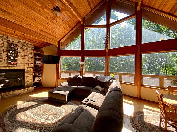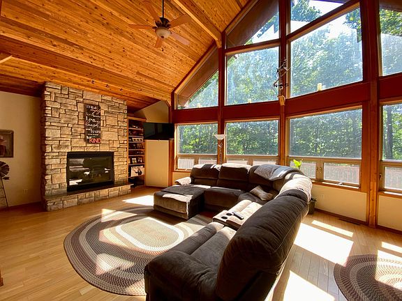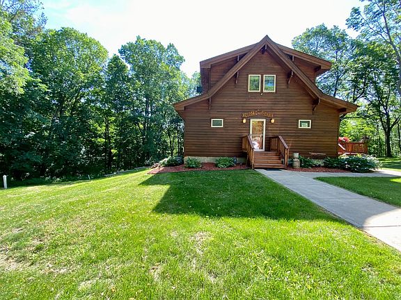 Naturally beautiful & easy to enjoy, this hide away offers a comfortable home featuring an open living space with floor to ceiling windows, stone fireplace, & beautiful, wooded views from inside or out on the wrap around deck with hot tub. The lower-level family room with wood stove, large windows, features a walk out to patio area. Upper loft features a private master with walk in closet and master bath. Steel sided 32 x 30 heated garage with floor drain and generous storage for all your toys. The 28 acres is mainly wooded with mature walnuts and maple trees, spring fed pond, and groomed trails offering a peaceful setting to enjoy wildlife in their natural habitat. An easy drive to area stocked freshwater trout streams and paved trails of Historic Bluff Country.