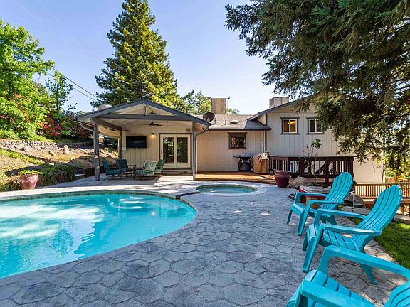 IN GROUND POOL awaits you at this 1.58 acre secluded property. Bring your boat, RV and toys as they can all be accommodated with 2 parking pads as well as the attached 2 car garage. A formal entry provides a coat closet and nook to hang your hats. The conventional living room is complete with a built-in entertainment center and cabinets, bay window nook with storage and propane fireplace. A formal dining room is just off the kitchen and offers a slider onto the back covered patio. Granite counters finish off the kitchen while offering a built-in desk, pantry cabinet and breakfast bar. All the bedrooms are conveniently on the split upper level each with blinds, carpeting and 1 guest room with a walk in closet. The master suite offers a custom tile shower, walk in closet and mountain views from the corner window. BONUS ROOM at lower level would make a great hobby, play or craft room as the laundry room sits just off the side with a sink. The backyard oasis has provided a space for many enjoyable gatherings with the covered patio to watch your favorite sports games, deck to BBQ on and the shaded poolside setting to lounge. A fenced garden area is ready for you to start planting and already offers grapes and fruit trees. Located at Sonora's best kept secret, the Mt. View Acres a centrally located subdivision near town.