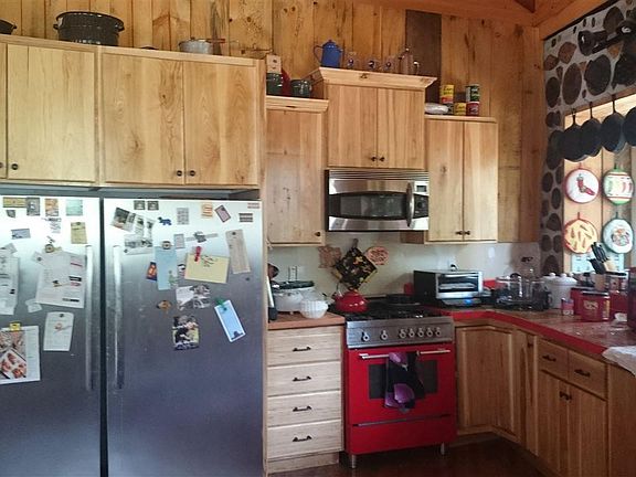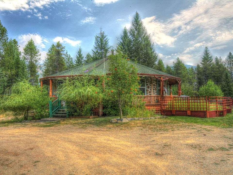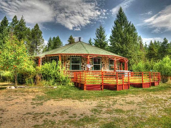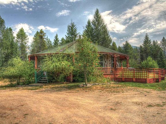 One of a kind home on 8 acres with an open floor plan, exposed beam ceiling, concrete counter tops and a circular plan with Montana feel. A dual shower head, slate walk-in shower and tiled tub with an enormous window makes the main floor bath a treat. Full, partially finished, walk out basement with 3/4 bath framed in. Wood heat, propane monitor back-up with potential for in-floor heat as plan c. Set up for horses with shelter, fencing and cross fencing, as well as storage buildings. A large board and batten barn sits ready for equipment and/or projects. Sit in the hot tub out on the surround deck. Level, treed acreage close to the recreational paradise of Trout Creek Montana. Adjacent property for sale.