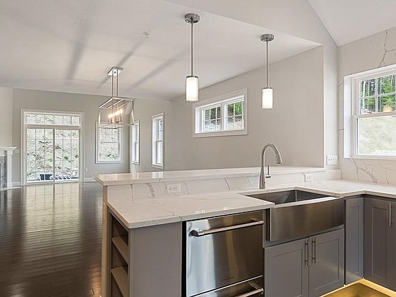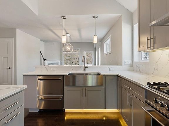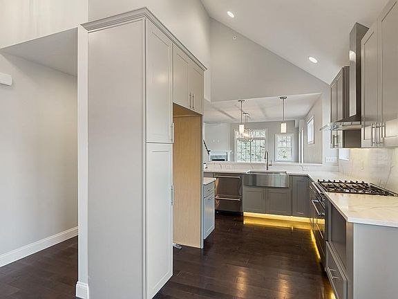 - Kit Dscrp: Flooring - Hardwood, Countertops - Stone/Granite/Solid, Breakfast Bar / Nook, Recessed Lighting, Dining Area, Stainless Steel Appliances, Gas Stove, Peninsula, Lighting - Pendant