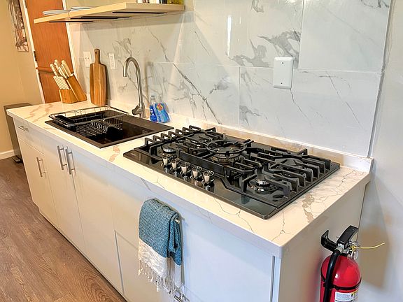Full kitchen with quartz countertops + dining area
