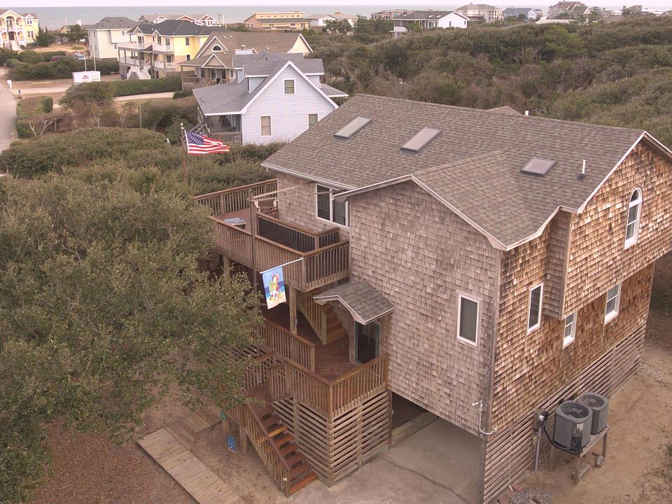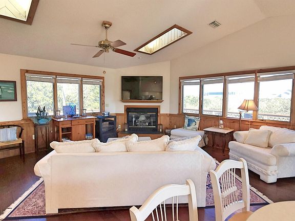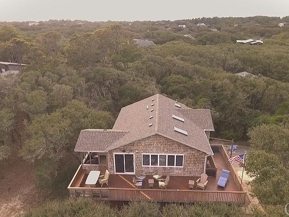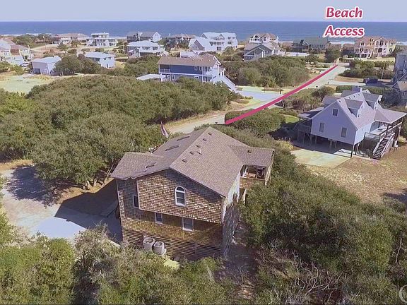 Rare oceanside opportunity in Sea Crest Village!  Lovingly tended cottage just six lots from the Seventh Street Beach Access.  Enjoy 2,000 sq ft of living space on a spacious half-acre lot.   The top level features an open living/dining/kitchen area with distinctive eucalyptus hardwood flooring and ventless gas fireplace. Use the convenient cargo lift to bring groceries and luggage upstairs. New skylights in the cathedral ceiling draw in light, and juniper wainscoating adds flair.  Decking flows around 3 sides of the home, including a screened area and expanded easterly decking with grand ocean views.  The top level also includes an expansive bedroom with direct access to the full bath.  Head downstairs to admire the custom tile foyer featuring a compass rose.  Two rooms on the east side share a Jack & Jill bath, and each has a slider leading to additional extensive covered decking.  One is currently staged as a den, but the septic system accommodates 4 bedrooms. The last bedroom has direct access to the hall bath, and features one of many cedar closets.  The ground level has a large storage area with a lockable owner's space featuring plenty of shelving.  The grounds are nicely groomed to to enhance the natural setting in the front yard and an open space in the rear where deer gather to graze.  Step along the wooden walkway on your way to the beach, or enjoy the shade on the bench under the live oaks. The home has been lovingly maintained, with new fortified roof and newer HVAC systems. Southern Shores is a sought out community with close proximity to the Wright Memorial bridge, and the quiet street has no through traffic.  This home would make a great primary home or investment property.  The lot should allow room for a pool to maximize rental capability.