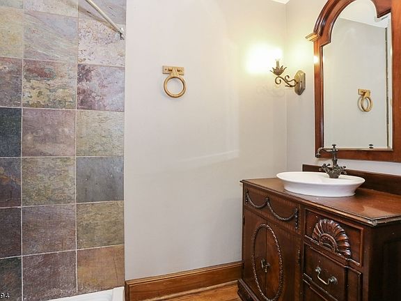 This charming and well maintained home has much to offer.Enter into the hardwood floored main level with LR, BDRM, FBATH, and DR. A side entrance leads to the flat backyard with shed and patio. The gourmet kitchen with custom cabinets, granite tops features Viking stove top and ovens along with a Bosch dish washer and a farmers sink. The upper level has a large open area that can be used as a den or office along with a large second bedroom and generous master bedroom. The large full bath features a jetted tub and steam shower. The finished basement with a theatre room, a billiard room and laundry room has several areas for storage.