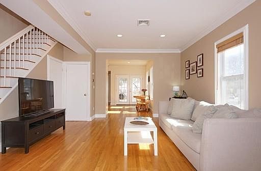 Beautiful townhome nestled at the end of a dead end street offers open concept living/dining/kitchen area. Features include shiny wood floors, high ceilings and lovely crown molding. Stainless/granite kitchen with recessed lights and French doors that open to expansive deck. There is also a half bath and laundry on the 1st level. The second floor has a wonderful master bedroom with en suite bathroom, walk-in closet and more of the lovely crown molding. There is also an additional full bathroom with walk-in shower, and another bedroom with wide pine floors on this level. The third floor features guest room and office or playroom space, making it ideal for visiting friends, a teen's room, or a home office with nice window views. The lower level offers space for playroom or office, as well as abundant storage. The private yard is enclosed with a fence and the unit has its own driveway. Near Town Field, commuter rail station, bus routes and all that Belmont has to offer!