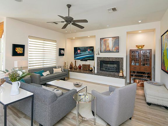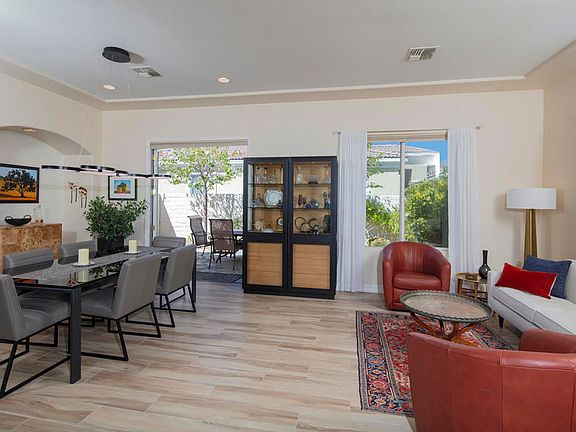 Expansive corner lot with exquisite landscaping, salt water pool, whirlpool spa and fire pit are all within the backdrop of the majestic mountains to create this idyllic desert setting. Brilliant sunrises and sunsets along with southern facing pool and backyard offer the best views in the community. Every design and detail has been meticulously selected and crafted for quality living indoors and out. The chef's kitchen with gourmet products includes double ovens, Viking 6-burner stove, and a beverage and wine fridge. The open concept design is bright and inviting while providing plenty of space for privacy and versatility with 3 bedrooms and an office with custom built-ins. Some of the special features in this extraordinary home includes, French doors, wet bar, custom darkening blinds, built in closets, retractable outdoor awning and 3 car garage with a/c. Walking distance to shops and outdoor dining, La Terraza is a wonderful secluded enclave with each home primed on a quiet cul-de-sac. Rancho Mirage is centrally located between Palm Springs and Indian wells for easy access to all Coachella Valley amenities and activities. Updates include owned solar in 2023, all new travertine floors and new carpet in bedrooms, new light fixtures, new recessed lighting, new garden lighting, new AC in garage, and added additional lush landscaping. This won't last! Call for your private showing!