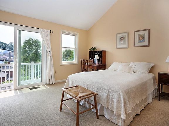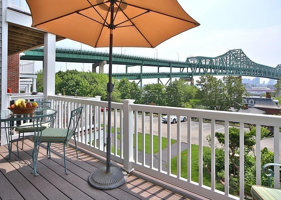 Charming townhouse located in tree-lined Admirals Hill. Rarely available brick front 4 level townhouse with spectacular views of Boston Harbor and City Skyline. Main level offers eat-in kitchen with breakfast bar, powder room, plus living area with natural fireplace, and sliders that open to large sunny deck with dramatic views. Second level features master bedroom with en suite bath and deck. Also on this level is another generous bedroom and bath. Third level is a spacious loft-style bedroom with cathedral ceiling. The lower level offers floor to ceiling book case in den/office, cedar closet, and utility. Amenities include: 2 assigned parking spaces, pool membership, tennis courts; convenient to all major highways, walking paths and marina along Waterfront Park. Close to shopping and restaurants, as well as an easy commute into Boston and Logan.