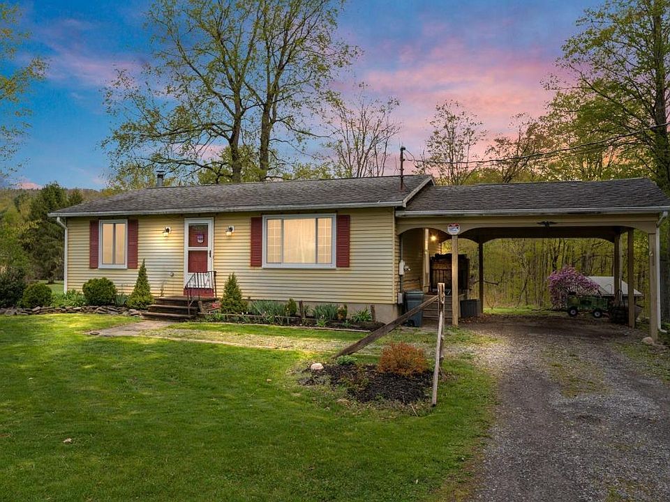 Nestled at the end of a quiet street, just a 7-minute drive from Ithaca, this affordable home is all that you have been searching for. Located on a cul-de-sac on a flat 1-acre lot surrounded by woods and deep creek beds, you can enjoy the views and sounds of nature, walk the trails to Newfield, and play in the large yard and dead-end street. Light streams through the windows into the beautiful kitchen that overlooks the flower gardens. The full basement with tall ceilings provides you the opportunity to add more living space. The size and wood stove assist in a low utility bill, and the possibilities for expansion are endless. The home is updated and move-in ready with a new hot water tank, appliances, and windows. Enjoy quiet and affordable single level living in a friendly neighborhood. Open House Sunday 4/30/23 12-2pm.
