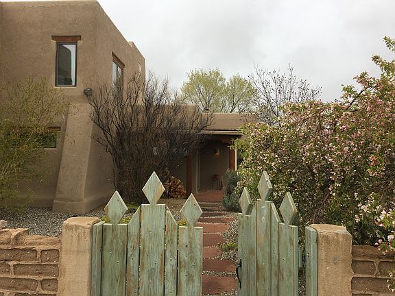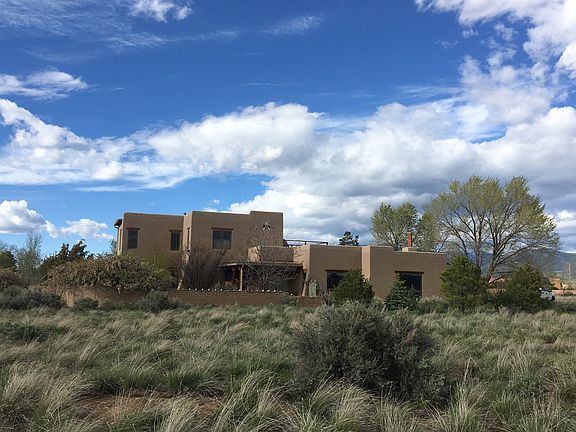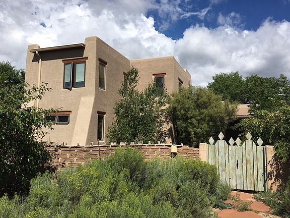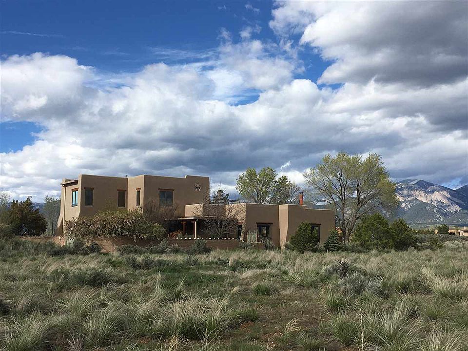 This custom-designed, two-story home offers uninterrupted mountain views from its desirable Upper Las Colonias location. From the landscaped covered porch area, step into a welcoming entrance area with full closet before entering the 1,300 sq ft great room. The open-plan kitchen, a dining area, and two living areas (one with a kiva fireplace) await you. Perfect for socializing with friends or a cozy night in with the family, this spacious great room offers spectacular views to the mountains. Built for entertaining, the kitchen has a wonderful flow and includes Corian countertops which match other counters throughout the house, a downdraft for gas range, plenty of storage as well as an open feel. On the same ground floor, find three bedrooms, an office area, a wet bar, two full bathrooms, large laundry room and a two mud rooms offering ample storage. Additional features include a hidden art closet and safe as well as incredible viga ceilings, quality flooring, numerous windows framing fantastic views. Thoughtfully designed, this home offers skylights, European hinged built-ins, covered portales, and cedar-lined closets throughout. The easily accessible second-floor 630 sq ft master suite offers full bathroom, characteristic viga ceilings, plenty of closet space, and a private northeast facing deck perfect for enjoying magnificent views and stunning sunrises. The expansive grounds afford plenty of space for outside activities, and for those with a dog(s), don't forget to check out the 1,100 sq ft enclosed area with original dog house. The property offers a fully enclosed backyard with original adobe wall, patio/deck area, and lush grass yard. The views from the hot tub are breathtaking. Also note that the exterior walls of the house are fortified with buttresses that also provide architectural dimension to the two-story adobe. An attached 676 sq ft two-car garage includes a private storage area and is easily accessible with a level grade for ingress and egress. The house is conveniently located relative to quiet Taos Regional Airport, Taos Ski Valley, The Rio Grande del Norte National Monument (and hot springs), Taos Plaza, hiking, and the golf course.
