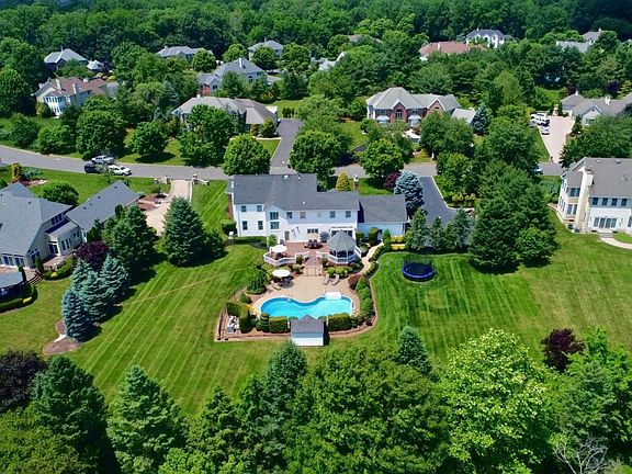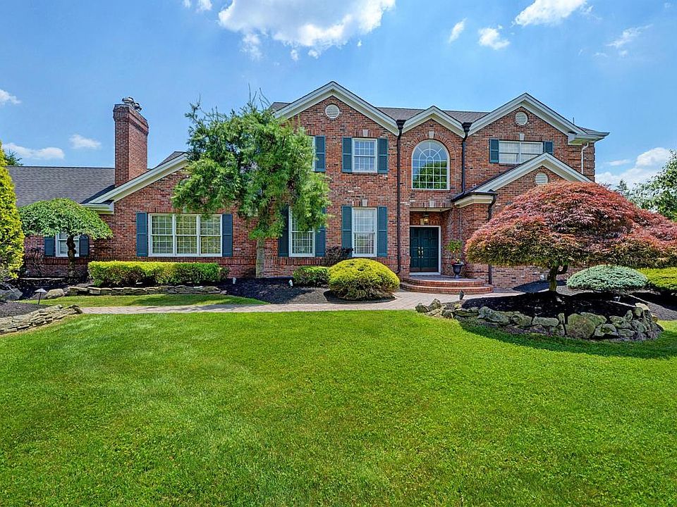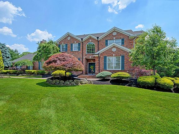 Saltwater heated pool open and welcomes you home to The Vineyard neighborhood of Holmdel. Red Brick Colonial. Two story foyer with soaring 20ft ceiling accompanied by decorative molding invites you inside this suburban paradise. Hardwood oak floors throughout first floor. Dining Rm w/butler pantry, large formal living room w/fp, and sunken family rm with high vaulted ceiling with w/b fireplace. Gourmet kitchen w/open floor plan; SS appliances, granite counter tops and oversized center island. Sliding doors from kitchen open up to 1+ acres with large landscaped yard. Partially finished basement with ceramic floors, high hats and rec room/bar. Separate room with full bath. Additional closet space and large area for storage.Easy commute to NYC via train, bus or fast ferry.Close to GSP, park