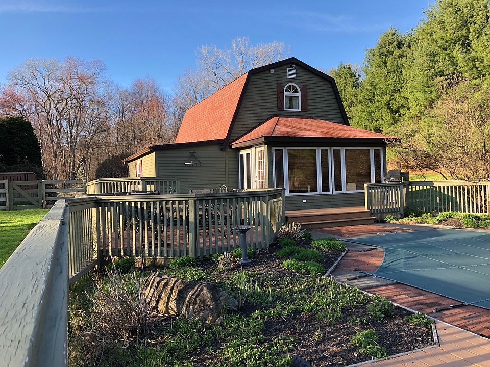 A Country Dutch Colonial Farmhouse with a guest cottage and in-ground pool. Sited on 4 bucolic acres of sweeping lawns, landscaped with lush perennial gardens and mature trees. This custom built home features 3 levels of living space with 3 bedrooms with a 1st floor master suite, 2 full bathrooms, kitchen w/island, formal dining room, living room with original barn beams and wood stove, formal dining room, a lower level walk out family room with wood stove, a large gym/office room and laundry room, central air, full house automatic generator and much more. The separate guest cottage has 1 bedroom, full bath, a living room plus a one car garage. The cottage is a part of an entertainments area with the inground pool, extensive decking and perennial landscaping perfect for entertaining. Walk to Long Pond where the property has lake rights to the beach and boat launch area. This property has been meticulously cared for and is in move-in condition. Located on a quiet country dead end road minutes from Omega Institute, Rhinebeck village and Bard college. A perfect weekend retreat or full time house.