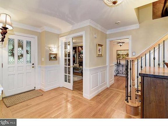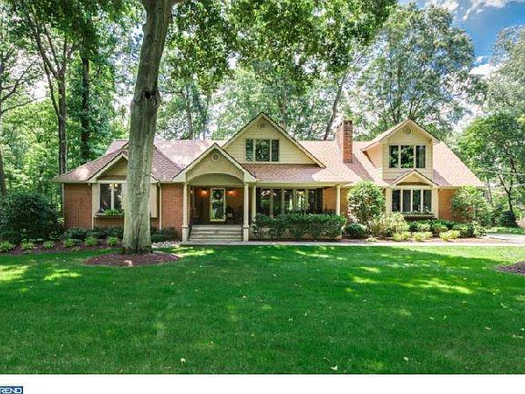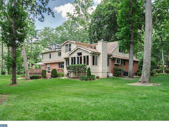 Gracious, custom built, 5 bedroom, 4 bathroom home completely remodeled and expanded, borrowing from the best of a Cape and the best of a Colonial on a sprawling, green 1.5 acre lot in Moorestown's Timbercroft enclave. An inviting covered front porch is the first of many peaceful spots to gather. The foyer is a prelude to the stately millwork found throughout the home. Floor-to-ceiling windows, gas fireplace with custom surround and millwork and ethereal, artist wall painting create a Living room unlike most. Current owner has outfitted the Dining room as a parlor with more custom millwork and painting. Remodeled kitchen has built-in Sub-Zero refrigerator, Bosch electric cooktop, Jenn-Air double ovens, marble backsplash and granite counters. Lovely cherry wood cabinets with a glaze reach the ceiling with extra tall moldings. The work area is open to the large breakfast room and ample family room with dramatic ceiling . . . all offering prime views of the huge back yard. Great open space for the way we live today! First floor also offers an office with French doors and custom built-in cabinet, full bathroom, guest bedroom, laundry room and a separate mudroom with essential built-in open cubbies and slate tile floor. The oak staircase with iron spindles brings you to three more bedrooms and three more full bathrooms, all beautifully remodeled. The Master suite has a sitting area, two large closets and full bathroom with dual vanity and oversize shower. The finished basement has a large media game room area with custom built-in cabinets to stow a wealth of items plus a walk-in wine storage closet. Great exercise room with mirrors and tile floor and still plenty of unfinished area for bulk storage in the basement. The turned two-car garage with carriage-style doors is oversized, and the property has lawn irrigation. Lots of other pleasant surprises such as artist hand paintings, large cedar closet, custom window treatments and plantation shutters, Andersen windows and great storage. An expansive back deck takes advantage of the serene, broad yard surrounded by mature trees in this near town neighborhood, located in the very desirable Baker Elementary School district.