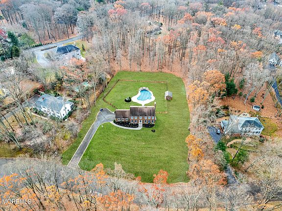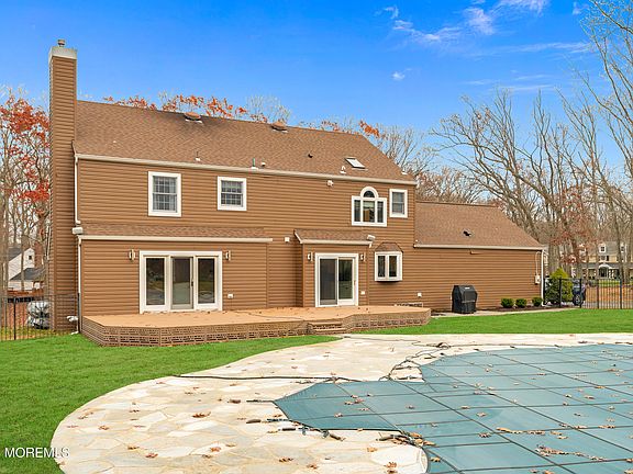 This stylish, meticulous, move-in ready colonial home is located in the desirable Clover Hill section of Colts Neck. First floor includes welcoming foyer, beautiful LR & DR with wonderful oversized windows, perfect for entertaining, family room with stacked stone gas fireplace, built-ins and oversized french doors to Trex deck overlooking private park-like 1.3 acre lot. Designer eat-in kitchen with Woodmode cabinets with pull out drawers, quartz countertops, center island and sliding glass door. Large laundry/mudroom & half bath. Second floor includes inviting primary bedroom with a fabulous bath: double sinks, huge shower with herringbone tile, freestanding tub & skylight. There are additionally three large bedrooms and full bath. Full finished basement offers huge open space for many uses. Magnificent heated Gunite Anthony pool with waterfall, spa & quartz pool surround. Property extends beyond fence. Throughout you will find Anderson windows, beautiful wainscoting moldings, recessed lighting with dimmers, hardwood flooring, & new designer interior doors. Also, underground sprinklers front & back, landscape lighting, paver walkway & paved driveway with Belgium block curbing. Quiet cul-de-sac location. This home is a complete package!