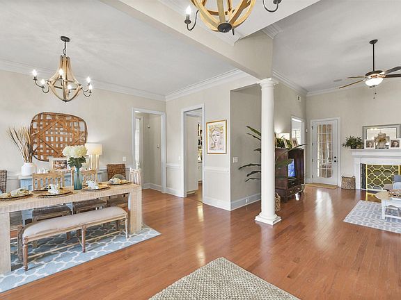 - RoomLivingRoomFeatures: Ceiling Fan(s), Fireplace, French Doors, Floors-Hardwood, Molding, Ceilings-High (over 9 Ft), Ceiling Fan