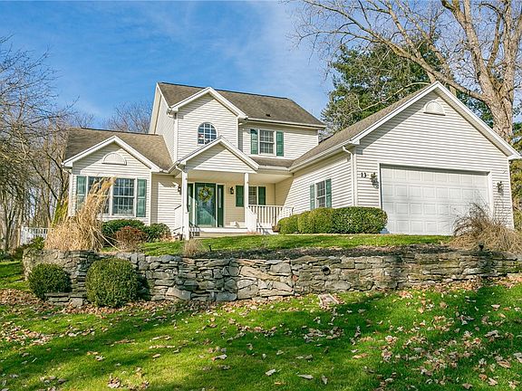 Welcome to 13 Creekview! This large Cape located in the Churchville-Chili School District boasts several amenities. The open floor plan allows for a semi-separated living room and 2 story foyer. The large eat-in kitchen with recessed lighting features an island with a beverage cooler and plenty of seating, ample cabinet and counter space, and a pantry. The first-floor primary bedroom includes a walk-in closet, a tiled shower, and access to the rear sunroom. First-floor laundry and oversized garage with additional entry to lower level. The Sunroom provides ample light with several sliding glass doors. Additional 2 bedrooms upstairs. The rear deck overlooks the spacious wooded rear yard. The lower level is nicely divided into a partially finished area with a half bath and storage/workshop area. The front retaining wall adds tremendous curb appeal. *Delayed Negotiations Until Tuesday, March 19th at Noon.