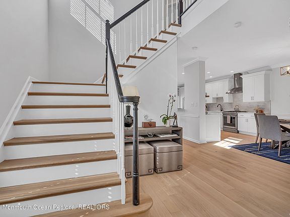 Upon entering, you'll be greeted by an open concept first floor, illuminated by brand new recessed lighting. The custom trim work throughout adds a touch of sophistication, while the real white oak hardwood floors create a warm and inviting atmosphere. The custom-designed eat-in kitchen is a chef's dream, boasting Jenn Air appliances and counter space for up to 7 seats.
