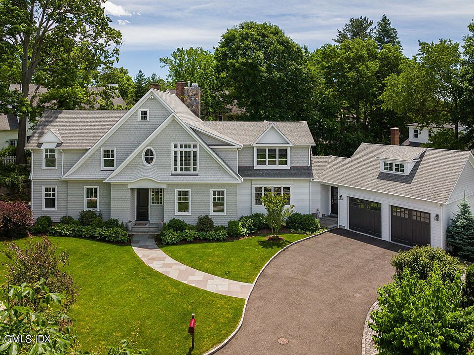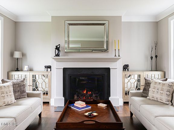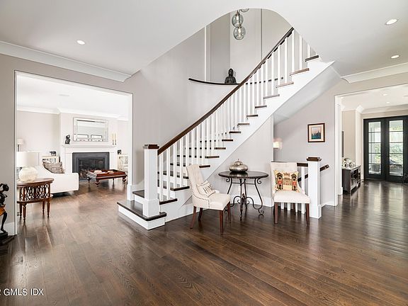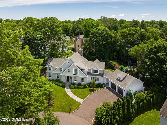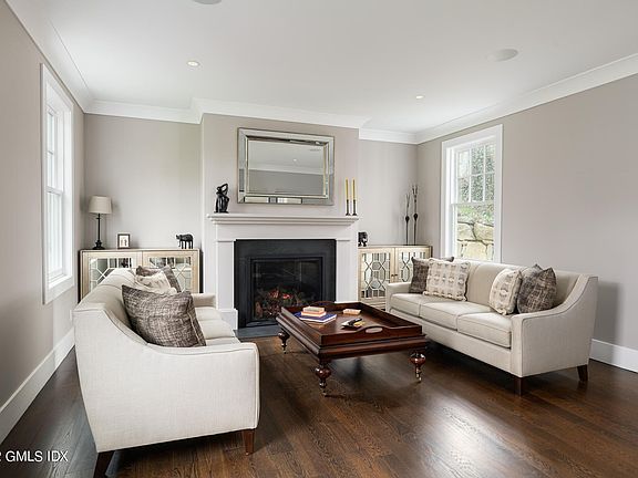 Stunning four-bedroom Colonial with wonderful stone terrace graces a pristine .29 acre on a peaceful cul-de-sac in the heart of Riverside. Built in 2017 showcasing sunwashed interior with hardwood floors and exquisite architectural details. Stylish entry hall with curved staircase unfolds into living room with fireplace, chef's eat-in kitchen with quartz- clad counters, center island, fabulous modern French doors which open to terrace and family room with electric fireplace flanked by doors to sunporch, also with fireplace. Office, butler's pantry, mud and powder rooms round out main level. Primary suite with walk-in closet and spa bath; three en-suite bedrooms, one with deck and laundry comprise second floor. Lower level offers rec/game room, gym, wine cellar, theater and full bath.