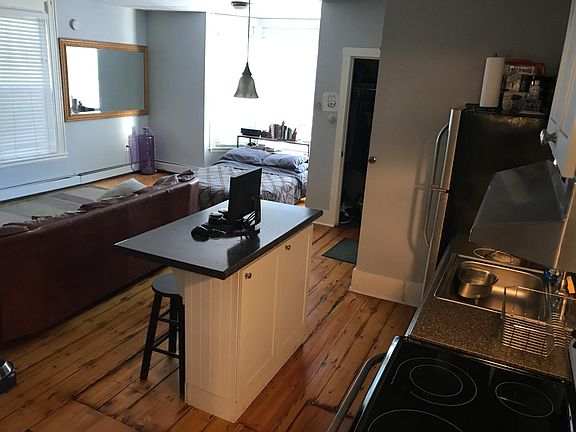 Available June 1. Sunny studio in quiet, secure bldg. Apt is on 1st floor, but it's elevated about 1/2 story, so people walking by aren't looking in at you! :) Fully renovated w high ceilings, lights, kitchen counter/faucet/cabinets, etc. Super cute kitchen w full sized stainless appliances! Bar stools provided for island in kitchen. Big Bay window! Full bath (tub shower w curved bar), new cabinet, lights, etc. Shared yard in back. Well-behaved PETS considered! (Pls describe yours. Dogs are considered, but had to put "ok" in the ad). Apt is small, but has a great open layout. Photos show everything from different angles, to show the size. Quiet, non-smoking building. Original pumpkin pine floors recently refinished. Light gray paint throughout. $1680 includes heat & hot water. Photos show the apt as if you stood in one place and turned to look around. NO smoking (of any kind). Heat n hot water included. Electric n wifi are the only utilities you'd cover. Street parking. Well-behaved pets considered. No parties.