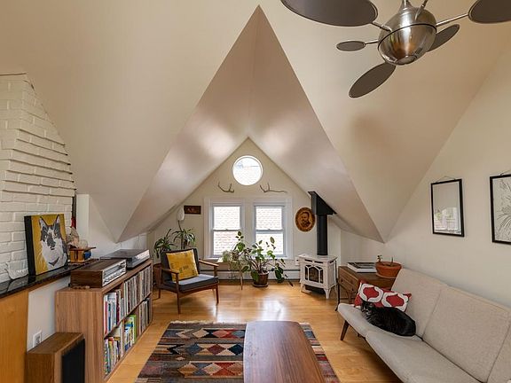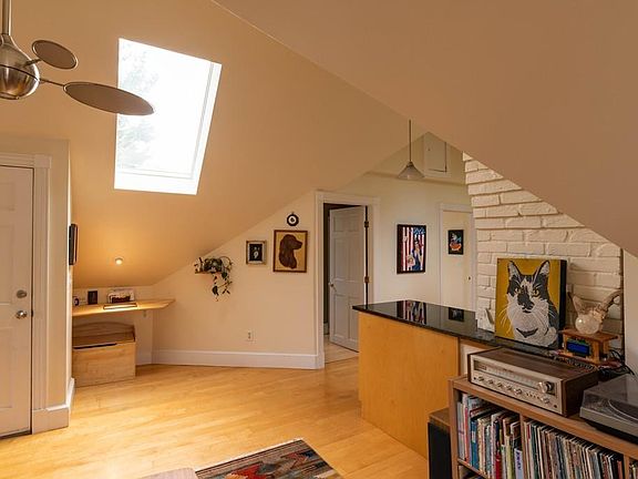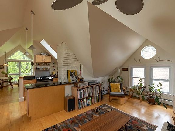 This light filled, modern 2 bedroom condo, nestled within the trees, abuts the bike path, and is steps from downtown Northampton. Skylights and floor to ceiling glass overlooking a mature maple tree flood the space with natural light, while a gas fireplace in the living room keeps you warm all winter long. This beautiful, eaved space boasts a custom built-in dresser in the master bedroom and a skylight in the second bedroom. The luxurious main bathroom includes a full sized Jacuzzi tub, automated skylight, and separate shower. A European style kitchen, which flows into the living room, includes high end appliances, contemporary maple cabinets, and granite countertops. The dining area looks out onto the Juliette balcony. On the ground floor, you will find ample private storage space for your outdoor gear, a second half bathroom, and your laundry. Two dedicated parking spaces ensure you will never have to search for parking. A quiet retreat, close to all the great downtown activities.