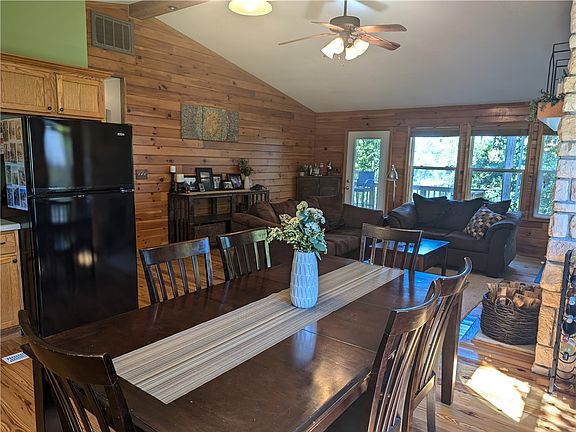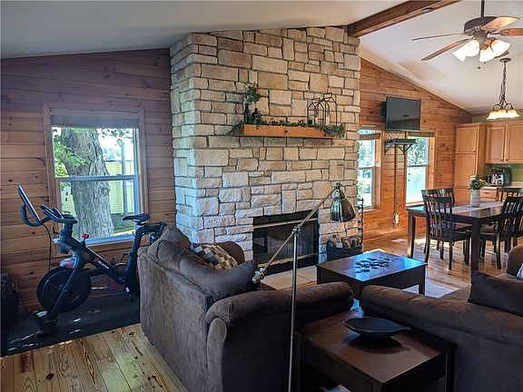 Quality built lakefront home with 2x6 walls, vaulted ceiling in the family room with a large stone fireplace, 2 full bathrooms including a masterbath, walk-in closet, and gorgeous pinewood floors in the family room and kitchen. New roof, central air, and rear deck in 2023. 10x14 patio w/firepit for relaxing and overlooking the lake. All appliances stay. Lake lease is $350/year