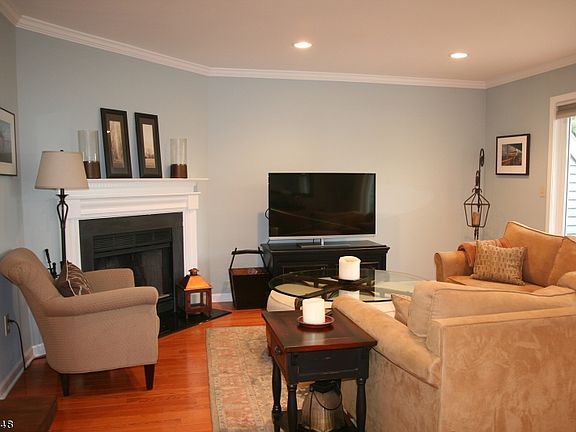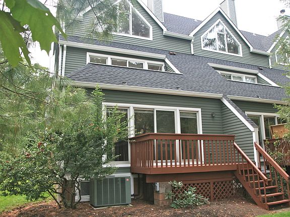 Renovated, bright, 3br, 2.1 bath, private end-unit w/walk-to town/train. Updated kitchen w/SS appliances, granite. Dining Room open to Living Room w/wood-burning fireplace and slider to 1 of 2 decks. Third floor Master Suite w/valuted ceiling, bath w/ new double vanity, soaking tub & separate shower. Second floor w/2 brs, one w/slider to second deck, updated bath and laundry. Additional features include a finished basement, hardwood floors on first and third floors, recessed lighting, newly painted, one-car attached garage. This townhome is situated in a pretty spot near woods yet walking distance to restaurants, shops & train.