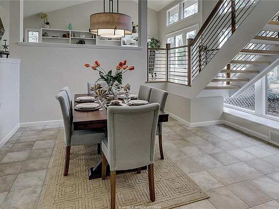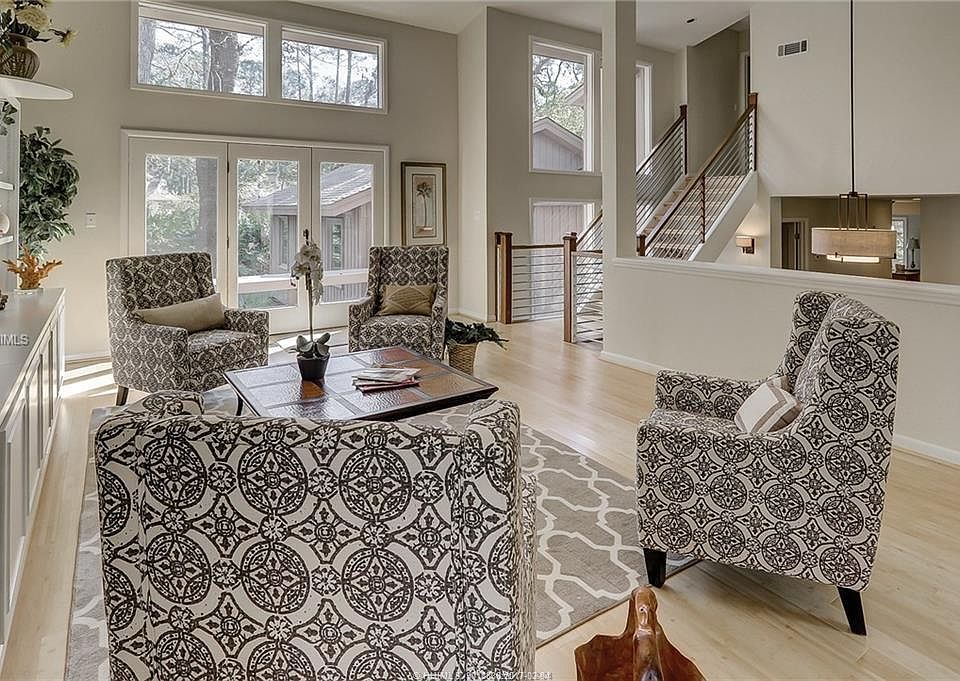 4 bedroom, 3.5 bath home in a fantastic location close to the front entrance of Sea Pines and a short walk to Sea Pines Country Club. Contemporary layout with high ceilings, fireplace, 2 masters, one downstairs and one up, modern kitchen with granite countertops, new stainless appliances. Full size lot with a lagoon view. Interior freshly painted, staged, and shows extremely well!