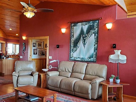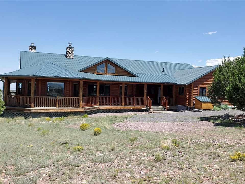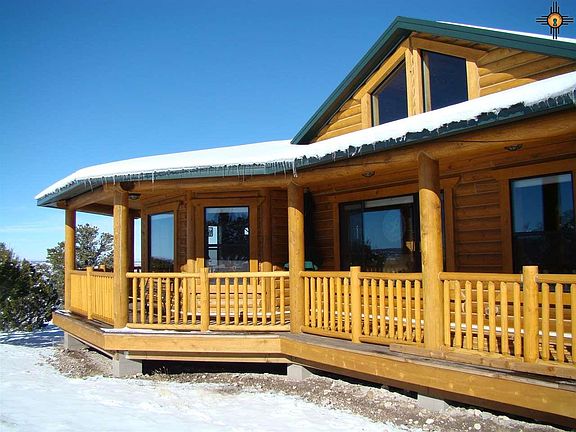 Perched on a mesa, almost every room provides a breathtaking view! The 2007 3B/3B log home offers a single floor ranch style with 2700+ sf plus an attached 2 1/2 car garage. The bay-walled kitchen (with stainless steel appliances, hickory cabinets, and sandstone counters) is open to the dining/great room. The great room has a vaulted ceiling, fireplace, and ETS heat exchange unit. The 3 bedrooms are all ensuite, with granite-topped vanities and walk-in closets. The master suite is separated from the bath area by a 3-sided glass/rock Heatilator fireplace. The bathroom includes a claw-footed slipper tub for two and a 4 x 4 rock/tile shower. One guest bedroom has a 10 x 20 living room, bath, and its own private entrance. There is an office, sun room, laundry room, large covered deck, and a large block crawlspace for cellar or storage. The well yields an estimated 7gpm. 11,000 kilowatt Generac backup generator. 2 stall log barn with tack shed. RV hookup. Borders BLM land on two sides.