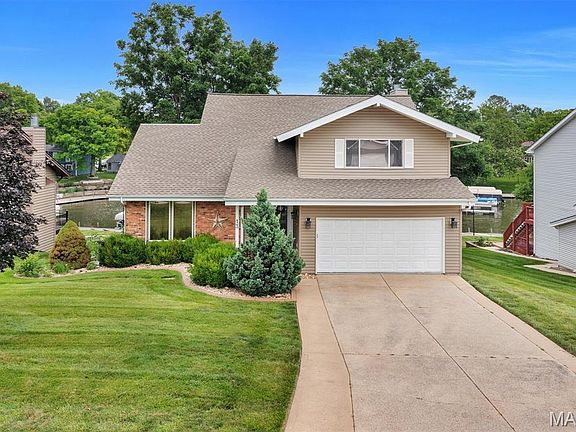 This stunning 4-bedroom, 3-bathroom lakefront home in Harbor Point Estates is a rare find, offering breathtaking water views, two boat lifts, and a pontoon boat. With 2,816 sq. ft. of living space, the two-story layout features vaulted ceilings, a stylish bar area, and a spacious recreation room, making it perfect for entertaining. The gourmet kitchen is equipped with modern appliances, wood flooring, and a wine cooler, while the primary suite provides a serene retreat with an ensuite bath and beautiful lake views. Nestled in a peaceful cul-de-sac within the Wentzville R-IV School District, this home combines tranquility with convenience, and with professional photos coming soon, you won’t want to miss your chance to own this lakeside gem! Interior photos are being taken Wednesday!