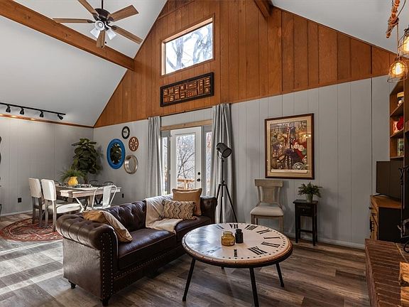 Check out this FUNky place - the almost famous ChickenHawkRocks! :-) This chalet style cabin sits snugged up to some seriously amazing bluffs & rock formations. Located on a quiet 2-home cul-de-sac surrounded by beautiful woods where all the critters play. Just a hop to the lake, community marina, golf, pool & the shopping/dining area of Holiday Island - Only 10 minutes to Main Street in downtown Eureka Springs & 2 turns off Hwy 23 North. Upper-level loft/flex space/office with bath (currently used as extra sleeping space for guests). Updates since 2022 include NEW roof & gutters, interior paint & flooring, lighting & ceiling fan, appliances, kitchen sink, toilets, exterior doors, fireplace chimney liner & cap. HVAC recently serviced & working great! 2-year-old stainless & black refrigerator & Samsung front load washer & dryer convey. Lots of deck space to hang out & watch the birds. Pick your own exterior paint/stain color & landscaping to make it shine! * *Agent owned**